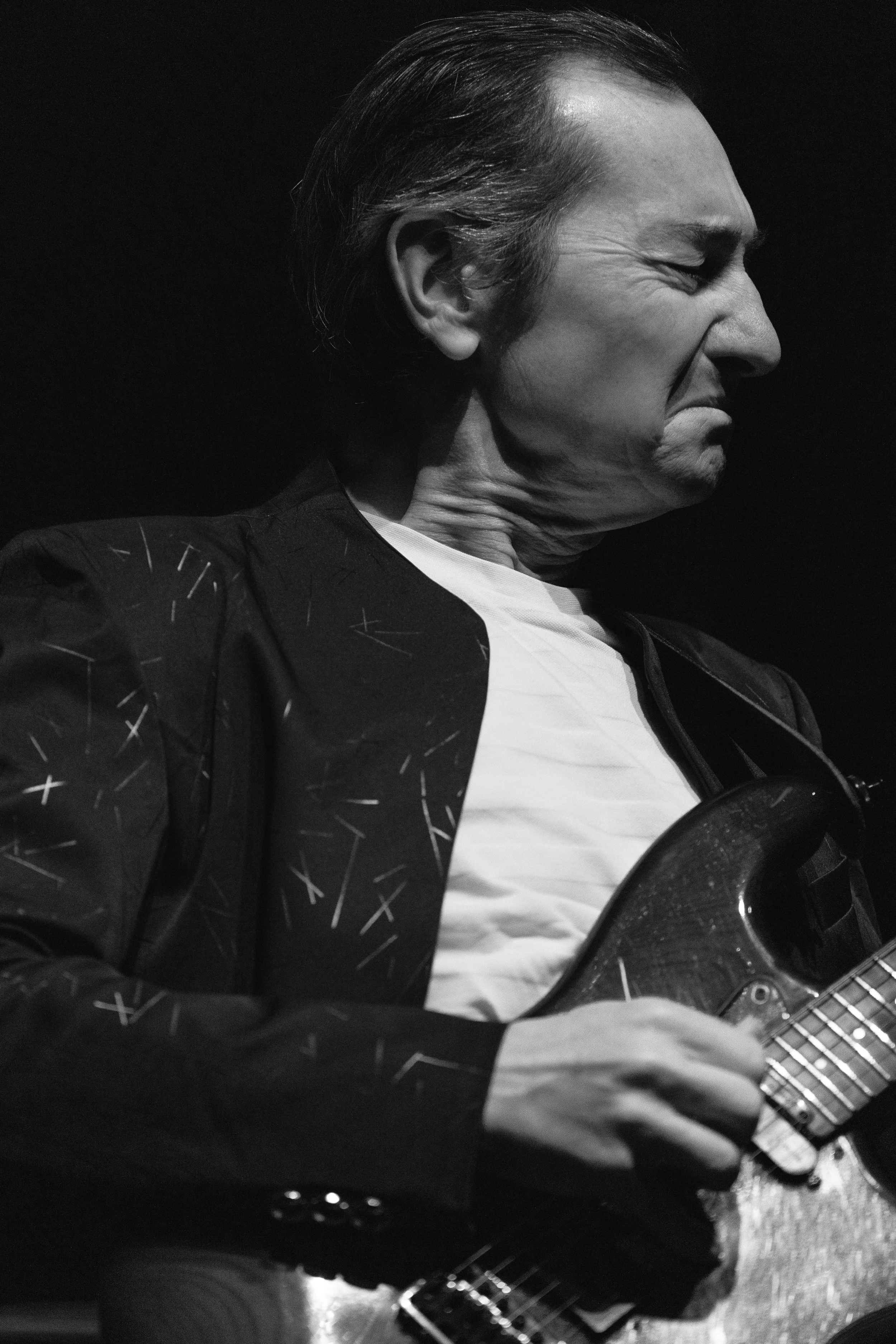Black and white photo of a man with slicked-back hair playing an electric guitar with his eyes closed and a serious expression.