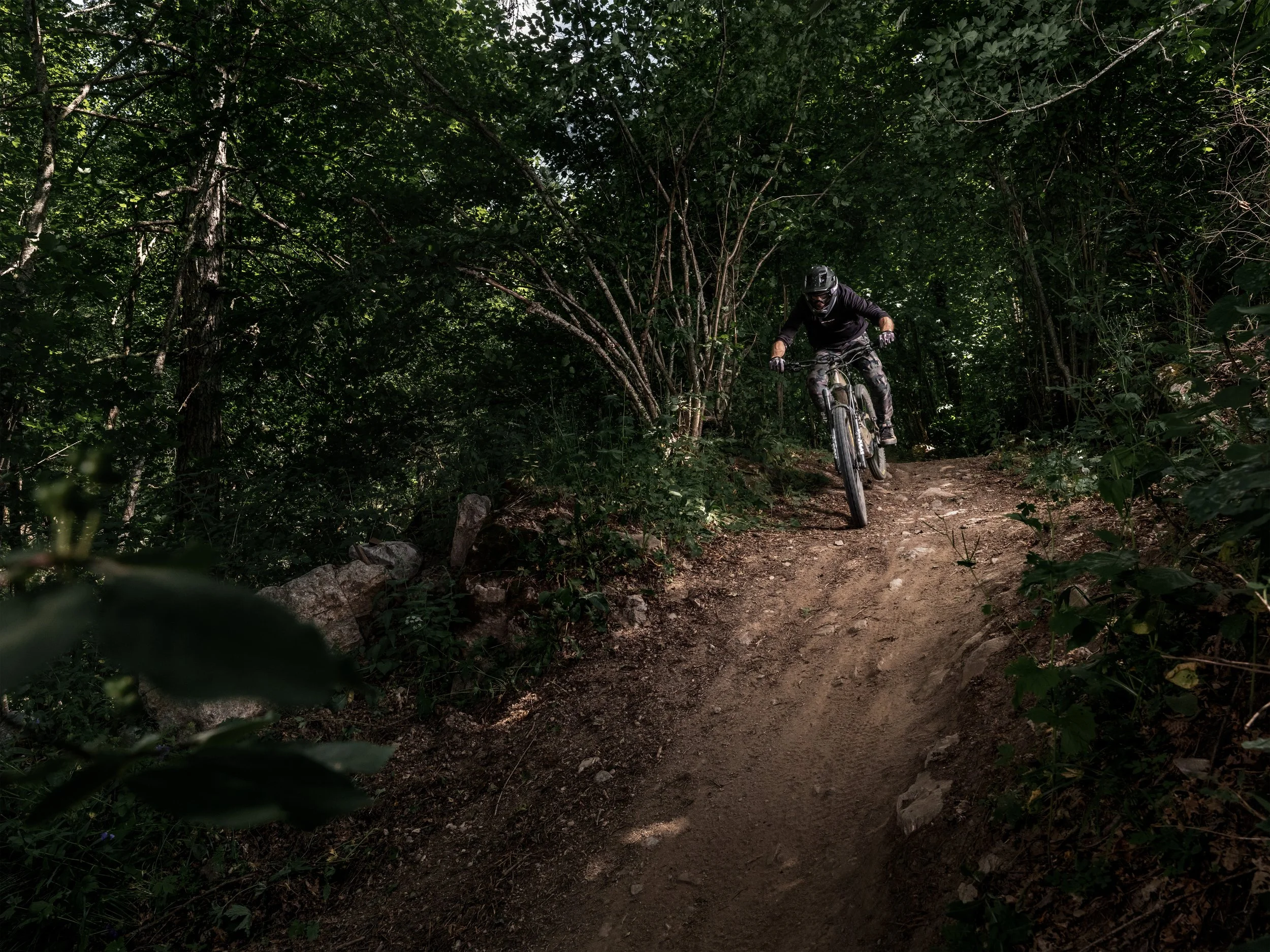 A forest scene with tall, narrow trees on a slope, two mountain bikers riding along a trail in the distance, sunlight filtering through the branches.