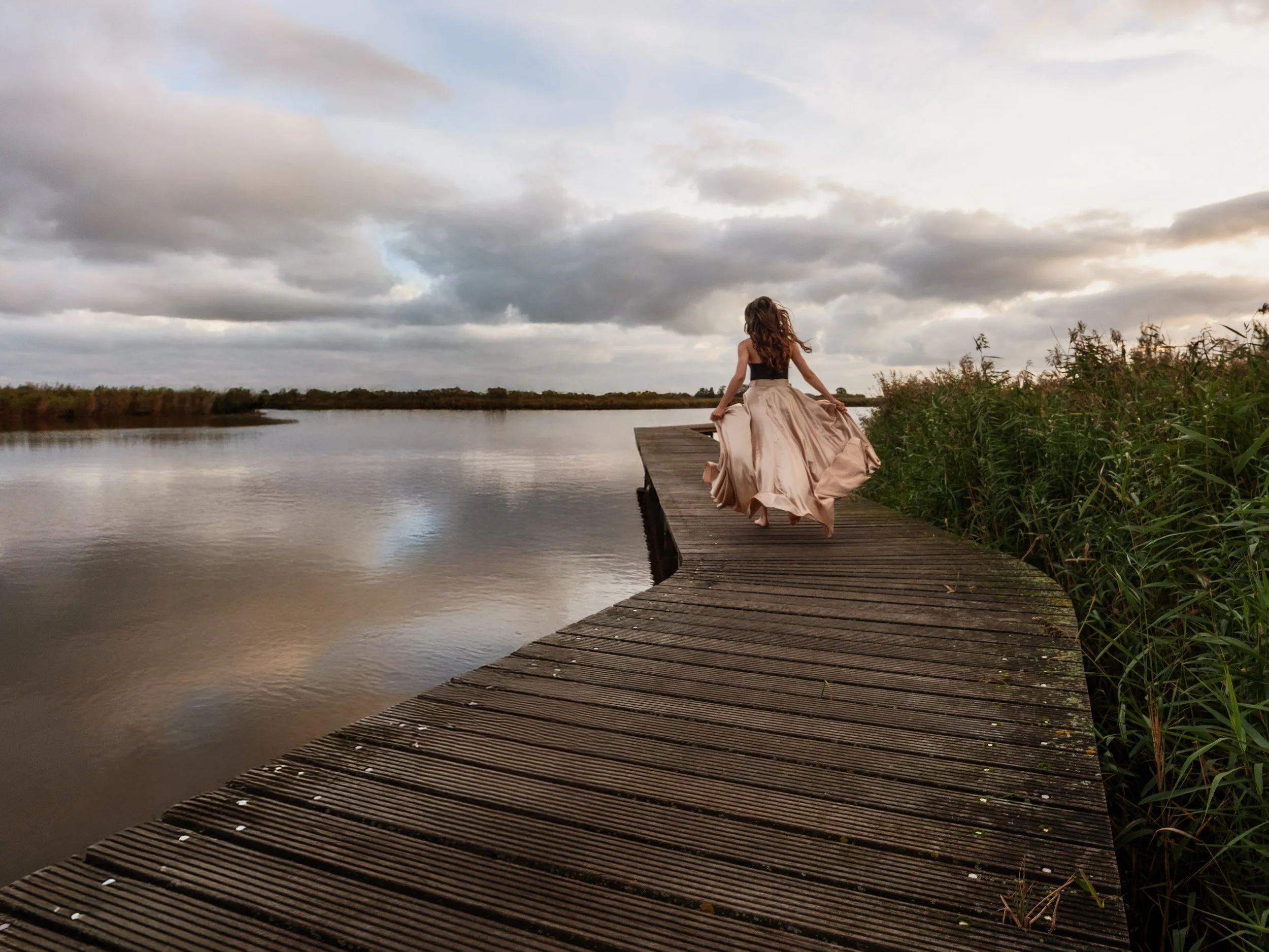 A woman in a long pink dress walking on a wooden boardwalk surrounded by water and tall grass, with cloudy sky overhead.